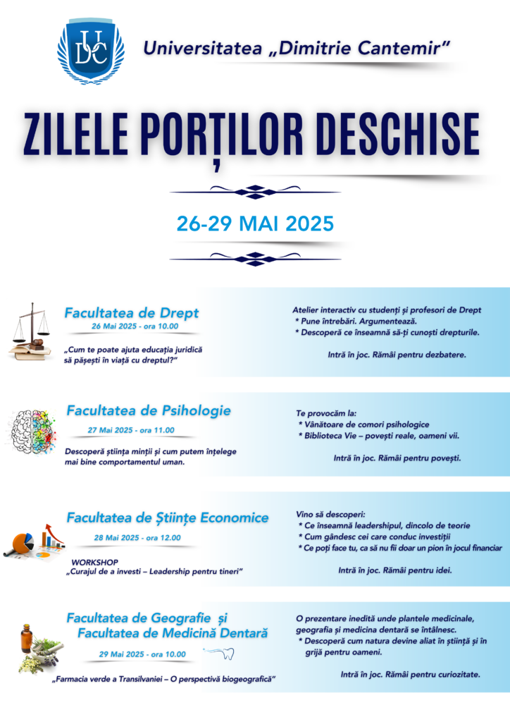 L’Università “Dimitrie Cantemir” di Târgu Mureș ti offre l’opportunità di muovere con fermezza i primi pași verso il futuro, scegliendo una delle specializzazioni messe a disposizione dalle cinque facoltà della nostra istituzione: Odontoiatria, Giurisprudenza, Economia, Psicologia, Geografia del Turismo.
